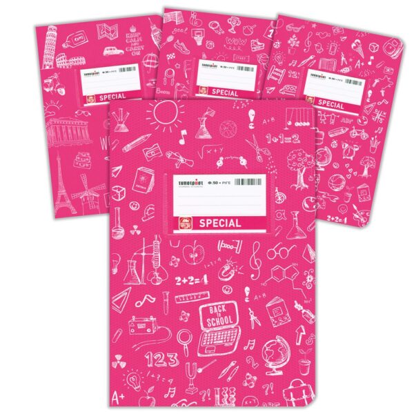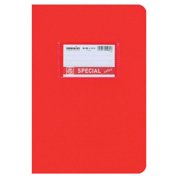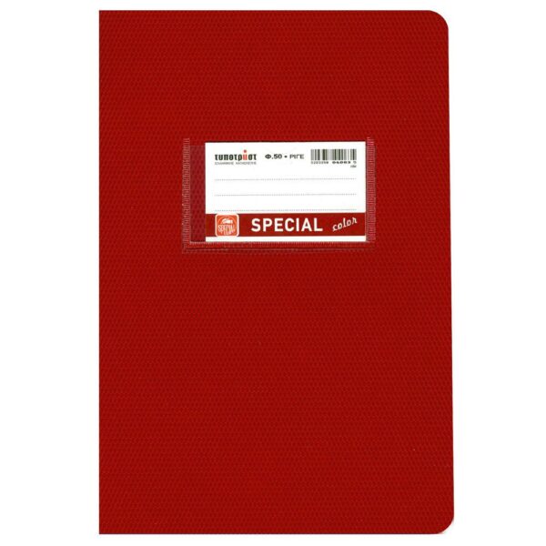 Κλασικό Special Τετράδιο 50 φύλλων, διάστασης B5 (17×25) με χρωματιστό ανάγλυφο πλαστικό εξώφυλλο. Τα φύλλα είναι από εξαιρετικής ποιότητας χαρτί 70γρ. και η γραμμογράφηση είναι ριγέ με σωστές αποστάσεις. Έχει στρογγυλεμένες γωνίες και προεκτυπωμένη ετικέτα 2 όψεων σε ματ χαρτί η οποία βγαίνει εύκολα χάρη στην εγκοπή. Διατίθεται σε 13 χρώματα (μαύρο, κόκκινο, πράσινο, μωβ, κίτρινο, πορτοκαλί, λαχανί, φούξια, γαλάζιο, γκρι, βεραμάν, μπορντώ, λευκό). Το απαραίτητο κλασικό χρωματιστό τετράδιο για του δημιουργούς του αύριο!